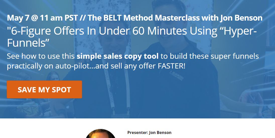 May 7 @ 11 am PST // The BELT Method Masterclass with Jon Benson “6-Figure Offers In Under 60 Minutes Using “Hyper-Funnels”